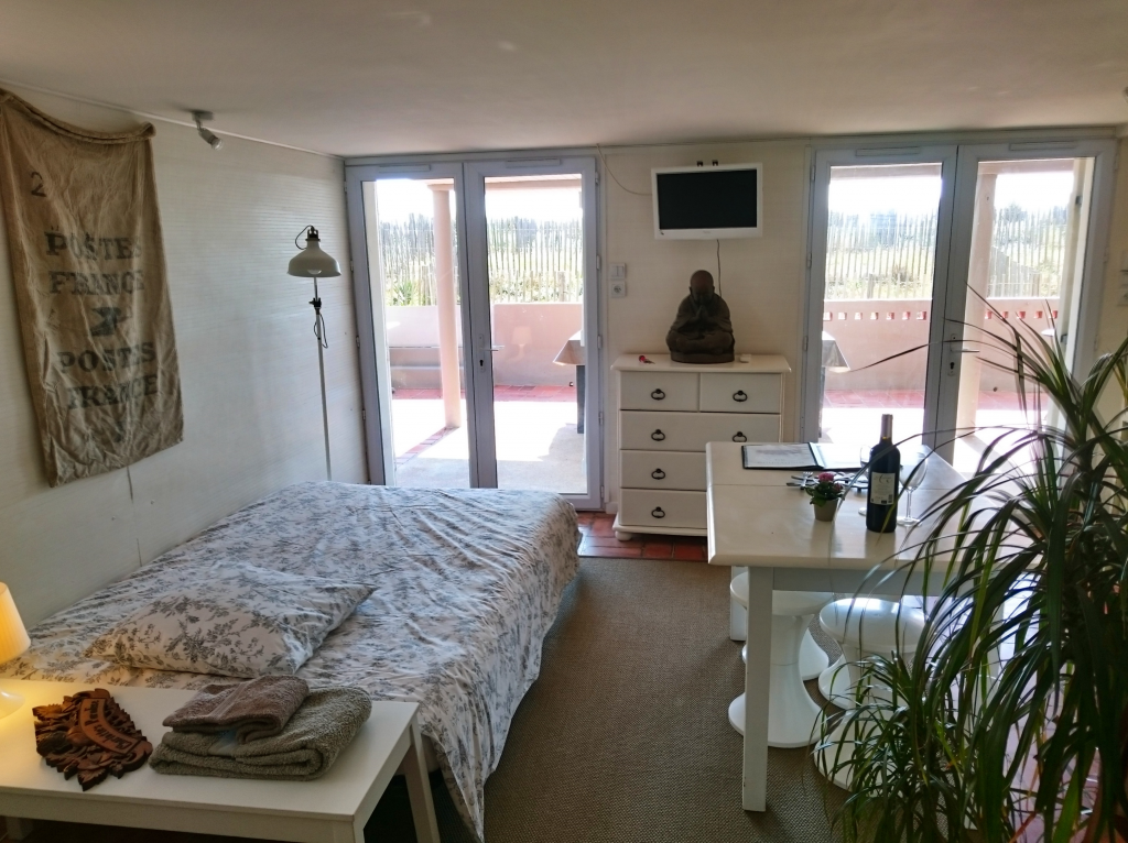 le studio est un espace de 28 m² lumineux, calme et rénové au rez-de-chaussée d’une petite maison. Le plafond est à 1.95m. La décoration a été pensée autour de matériaux naturels, dans un esprit très zen. le coco est au sol ou aux murs, les autres parois sont en bambou, le sol, en tomettes, date de la construction de la maison par mes grands-parents dans la deuxième partie du siècle dernier. J’ai souhaité conserver certaines parties d’époque telle la cuisine en « formica ».